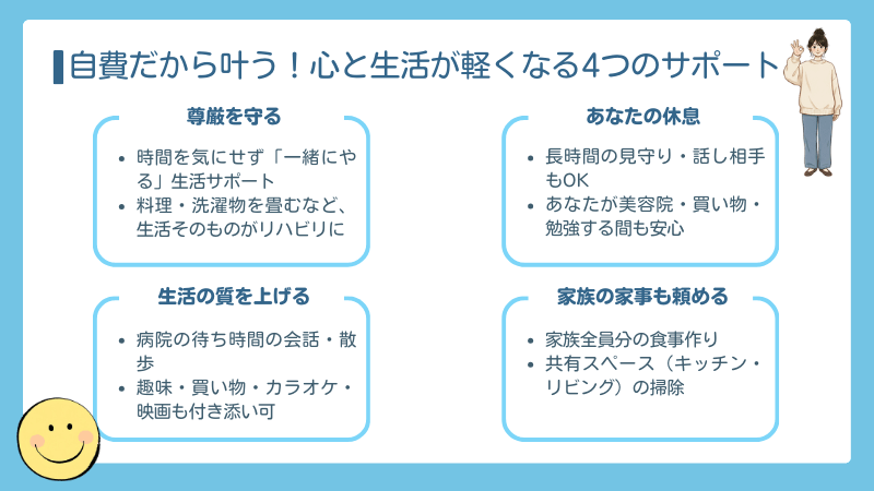 図:同居家族が自費でヘルパーを頼むと心と生活が軽くなる4つのサポート