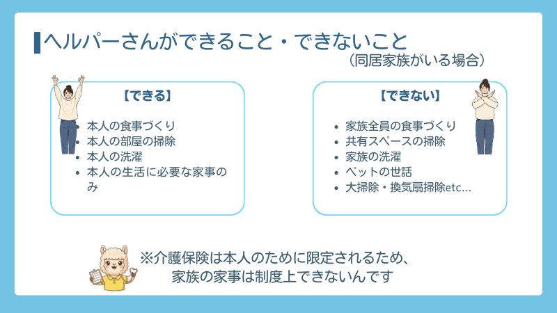 つまり、ヘルパーさんができるのは要介護者本人の生活に必要な範囲だけ。