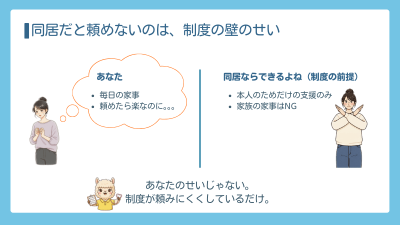 「ヘルパーは同居家族がいる場合、頼めないことが多い」